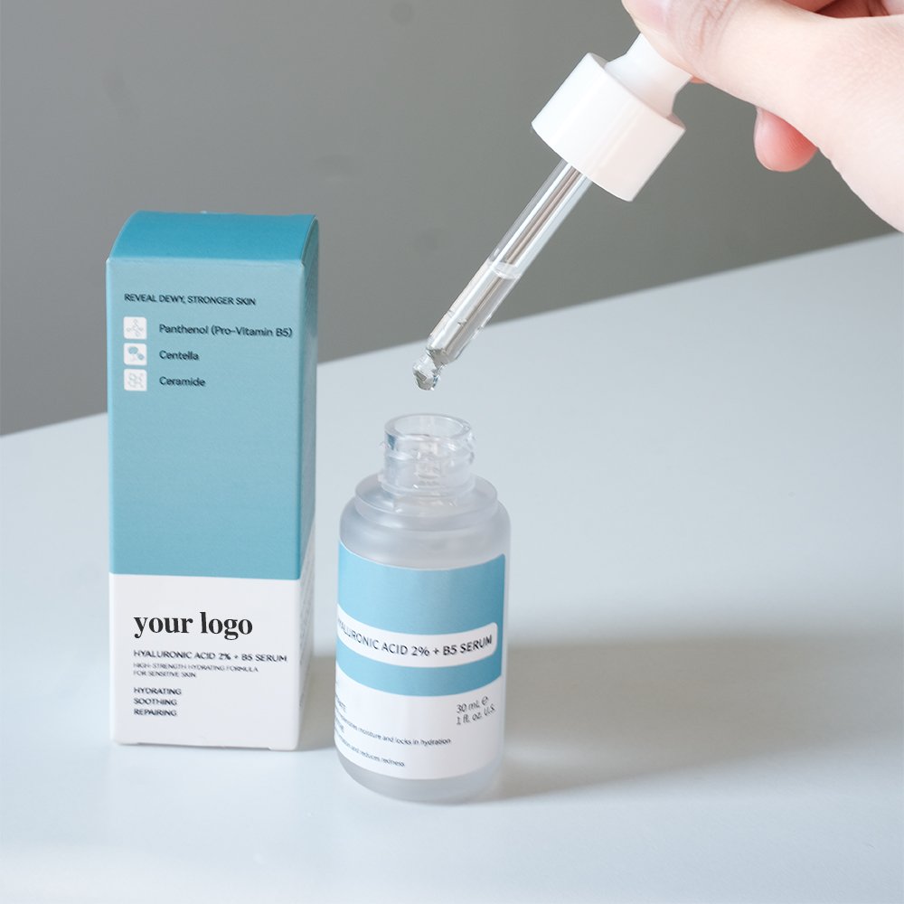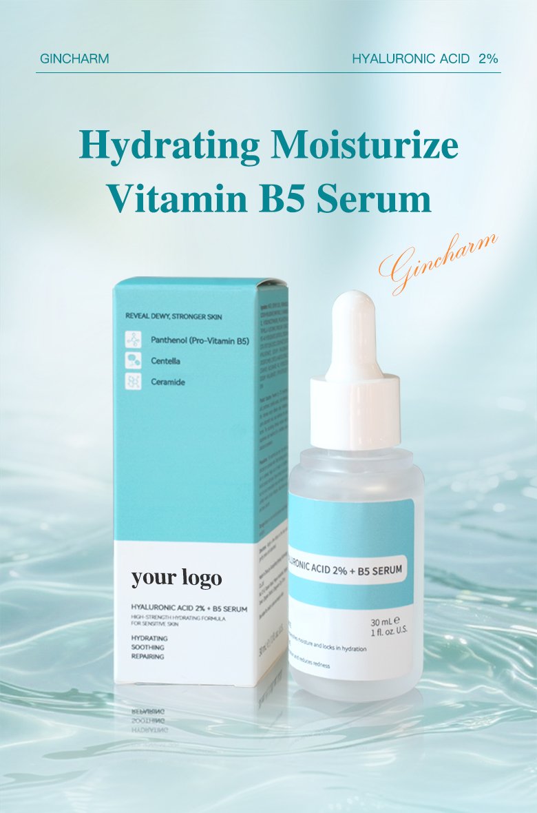 Gincharm Hydrating Vitamin B5 Serum is a multi-functional facial treatment that blends 2% hyaluronic acid, Vitamin B5, and centella asiatica to deliver deep, long-lasting hydration, repair the skin barrier, and soothe irritation. Its lightweight, fast-absorbing texture penetrates quickly into all skin layers, leaving the complexion plump, calm, and revitalized—ideal for brands focusing on gentle, moisturizing skincare solutions.